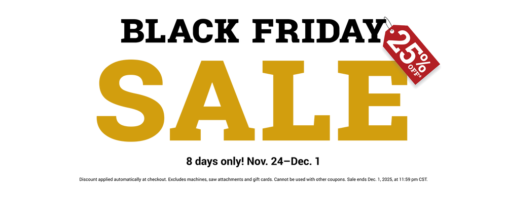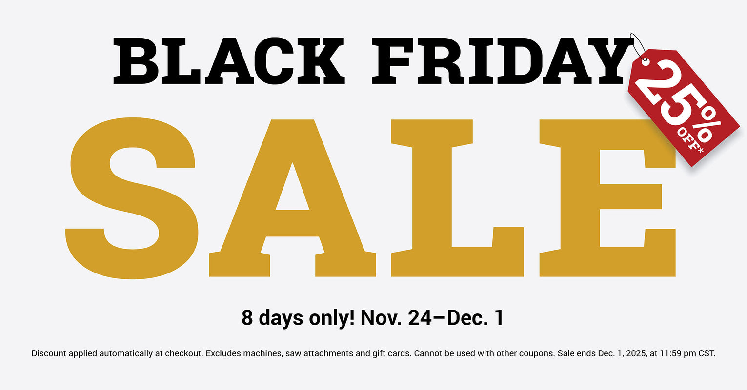 Shop our Black Friday Sale! Take 25% OFF your order Nov 24 - Dec 1! Discount applies at checkout. Excludes machines, trim saw attachments and gift cards.